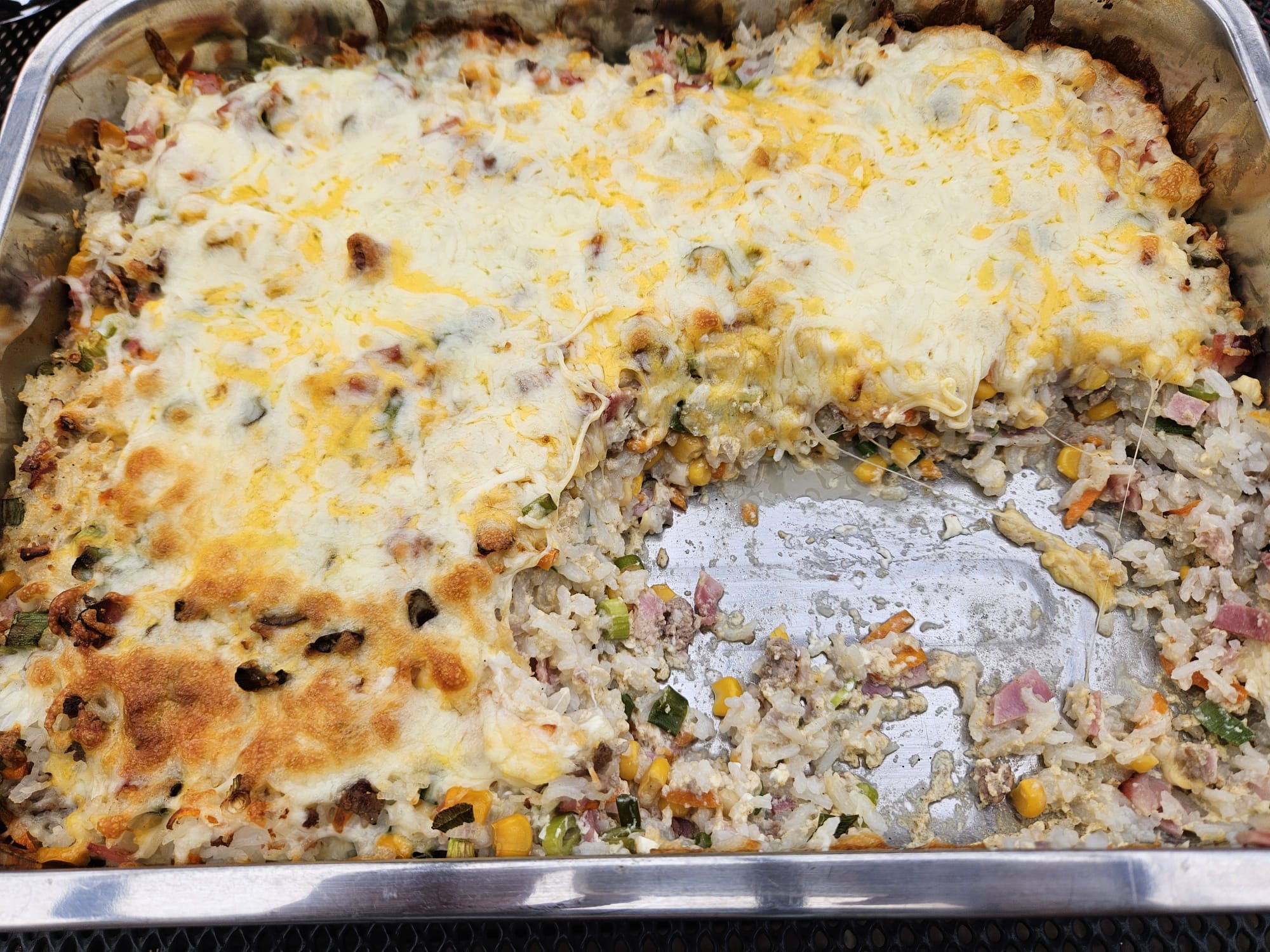 Alle Zutaten bis auf den geriebenen Käse vermengen und in eine Auflaufform geben.